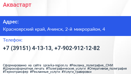 Аквастарт по адресу Красноярский край, Ачинск, 2-й микрорайон, 4 в дальнейшем Организация, размещена в следующих категориях: