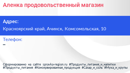 Аленка, продовольственный магазин по адресу Красноярский край, Ачинск, Комсомольская, 10 в дальнейшем Организация, размещена в следующих категориях: