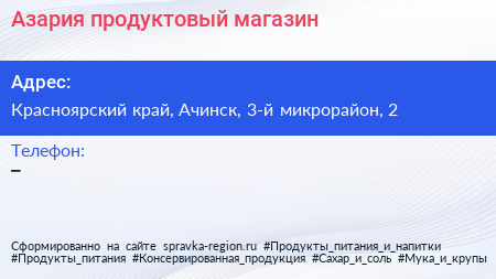 Азария, продуктовый магазин по адресу Красноярский край, Ачинск, 3-й микрорайон, 2 в дальнейшем Организация, размещена в следующих категориях: