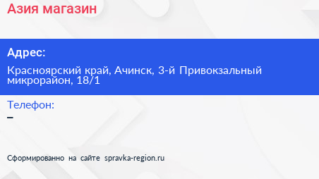 Азия, магазин по адресу Красноярский край, Ачинск, 3-й Привокзальный микрорайон, 18/1 в дальнейшем Организация, размещена в следующих категориях: