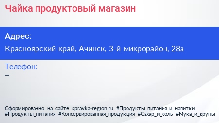 Чайка, продуктовый магазин по адресу Красноярский край, Ачинск, 3-й микрорайон, 28а в дальнейшем Организация, размещена в следующих категориях: