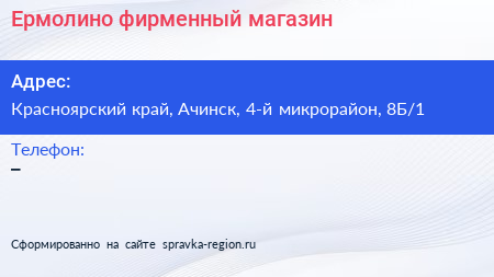 Ермолино, фирменный магазин по адресу Красноярский край, Ачинск, 4-й микрорайон, 8Б/1 в дальнейшем Организация, размещена в следующих категориях: