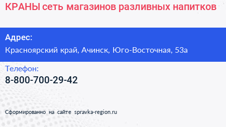 КРАНЫ, сеть магазинов разливных напитков по адресу Красноярский край, Ачинск, Юго-Восточная, 53а в дальнейшем Организация, размещена в следующих категориях:
