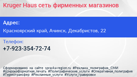 Kruger Haus, сеть фирменных магазинов по адресу Красноярский край, Ачинск, Декабристов, 22 в дальнейшем Организация, размещена в следующих категориях: