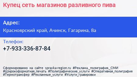 Купец, сеть магазинов разливного пива по адресу Красноярский край, Ачинск, Гагарина, 8а в дальнейшем Организация, размещена в следующих категориях: