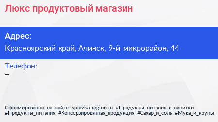 Люкс, продуктовый магазин по адресу Красноярский край, Ачинск, 9-й микрорайон, 44 в дальнейшем Организация, размещена в следующих категориях: