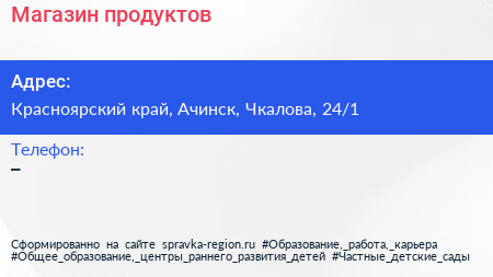Магазин продуктов по адресу Красноярский край, Ачинск, Чкалова, 24/1 в дальнейшем Организация, размещена в следующих категориях: