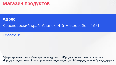 Магазин продуктов по адресу Красноярский край, Ачинск, 4-й микрорайон, 16/1 в дальнейшем Организация, размещена в следующих категориях: