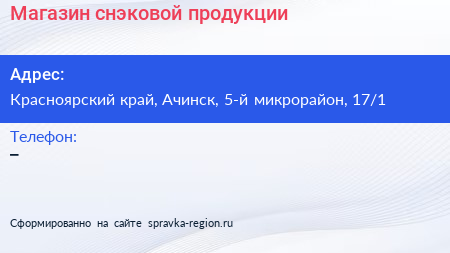 Магазин снэковой продукции по адресу Красноярский край, Ачинск, 5-й микрорайон, 17/1 в дальнейшем Организация, размещена в следующих категориях: