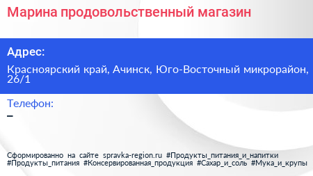 Марина, продовольственный магазин по адресу Красноярский край, Ачинск, Юго-Восточный микрорайон, 26/1 в дальнейшем Организация, размещена в следующих категориях: