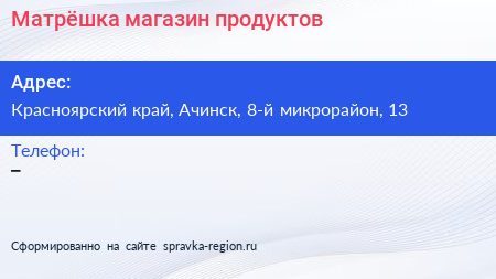 Матрёшка, магазин продуктов по адресу Красноярский край, Ачинск, 8-й микрорайон, 13 в дальнейшем Организация, размещена в следующих категориях: