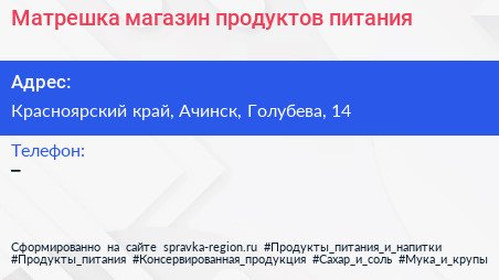 Матрешка, магазин продуктов питания по адресу Красноярский край, Ачинск, Голубева, 14 в дальнейшем Организация, размещена в следующих категориях: