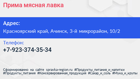Прима, мясная лавка по адресу Красноярский край, Ачинск, 3-й микрорайон, 10/2 в дальнейшем Организация, размещена в следующих категориях: