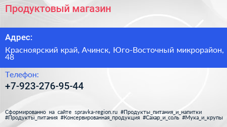 Продуктовый магазин по адресу Красноярский край, Ачинск, Юго-Восточный микрорайон, 48 в дальнейшем Организация, размещена в следующих категориях: