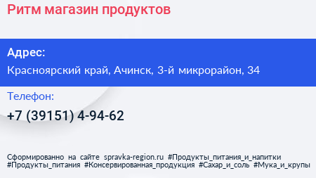Ритм, магазин продуктов по адресу Красноярский край, Ачинск, 3-й микрорайон, 34 в дальнейшем Организация, размещена в следующих категориях: