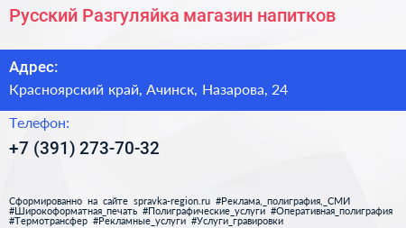 Русский Разгуляйка, магазин напитков по адресу Красноярский край, Ачинск, Назарова, 24 в дальнейшем Организация, размещена в следующих категориях: