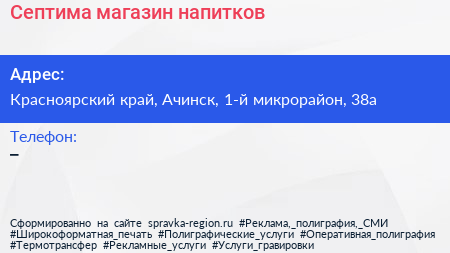 Септима, магазин напитков по адресу Красноярский край, Ачинск, 1-й микрорайон, 38а в дальнейшем Организация, размещена в следующих категориях: