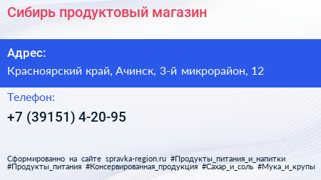 Сибирь, продуктовый магазин по адресу Красноярский край, Ачинск, 3-й микрорайон, 12 в дальнейшем Организация, размещена в следующих категориях: