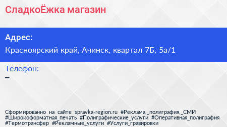 СладкоЁжка, магазин по адресу Красноярский край, Ачинск, квартал 7Б, 5а/1 в дальнейшем Организация, размещена в следующих категориях: