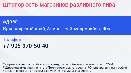 Штопор, сеть магазинов разливного пива по адресу Красноярский край, Ачинск, 5-й микрорайон, 40а в дальнейшем Организация, размещена в следующих категориях: