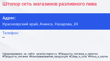 Штопор, сеть магазинов разливного пива по адресу Красноярский край, Ачинск, Назарова, 24 в дальнейшем Организация, размещена в следующих категориях:
