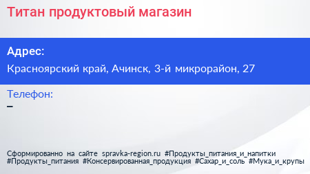 Титан, продуктовый магазин по адресу Красноярский край, Ачинск, 3-й микрорайон, 27 в дальнейшем Организация, размещена в следующих категориях: