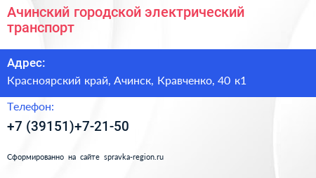 Ачинский городской электрический транспорт по адресу Красноярский край, Ачинск, Кравченко, 40 к1 в дальнейшем Организация, размещена в следующих категориях: