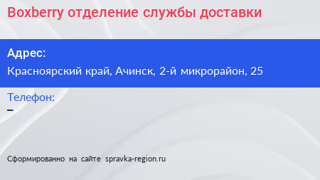 Boxberry, отделение службы доставки по адресу Красноярский край, Ачинск, 2-й микрорайон, 25 в дальнейшем Организация, размещена в следующих категориях: