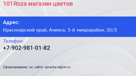 101 Roza, магазин цветов по адресу Красноярский край, Ачинск, 5-й микрорайон, 35/3 в дальнейшем Организация, размещена в следующих категориях: