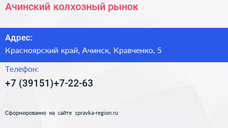 Ачинский колхозный рынок по адресу Красноярский край, Ачинск, Кравченко, 5 в дальнейшем Организация, размещена в следующих категориях: