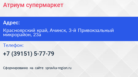 Атриум, супермаркет по адресу Красноярский край, Ачинск, 3-й Привокзальный микрорайон, 23а в дальнейшем Организация, размещена в следующих категориях:
