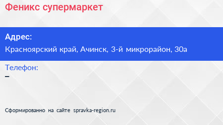 Феникс, супермаркет по адресу Красноярский край, Ачинск, 3-й микрорайон, 30а в дальнейшем Организация, размещена в следующих категориях: