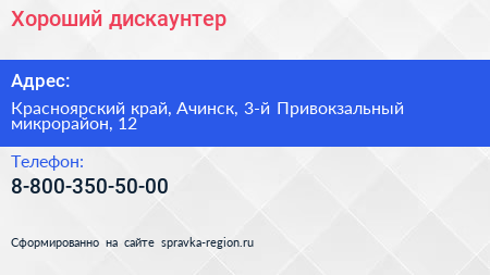 Хороший, дискаунтер по адресу Красноярский край, Ачинск, 3-й Привокзальный микрорайон, 12 в дальнейшем Организация, размещена в следующих категориях: