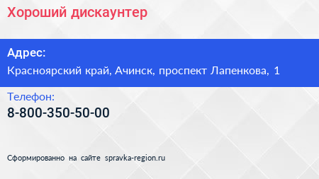 Хороший, дискаунтер по адресу Красноярский край, Ачинск, проспект Лапенкова, 1 в дальнейшем Организация, размещена в следующих категориях: