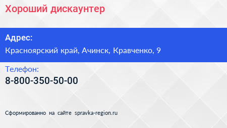 Хороший, дискаунтер по адресу Красноярский край, Ачинск, Кравченко, 9 в дальнейшем Организация, размещена в следующих категориях: