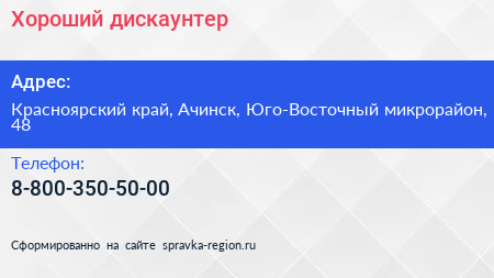Хороший, дискаунтер по адресу Красноярский край, Ачинск, Юго-Восточный микрорайон, 48 в дальнейшем Организация, размещена в следующих категориях: