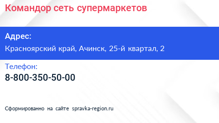 Командор, сеть супермаркетов по адресу Красноярский край, Ачинск, 25-й квартал, 2 в дальнейшем Организация, размещена в следующих категориях: