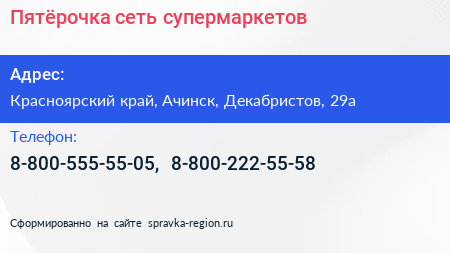 Пятёрочка, сеть супермаркетов по адресу Красноярский край, Ачинск, Декабристов, 29а в дальнейшем Организация, размещена в следующих категориях: