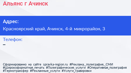 Альянс, г. Ачинск по адресу Красноярский край, Ачинск, 4-й микрорайон, 3 в дальнейшем Организация, размещена в следующих категориях: