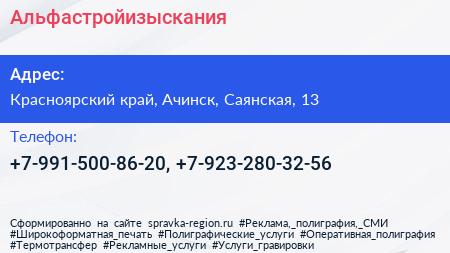 Альфастройизыскания по адресу Красноярский край, Ачинск, Саянская, 13 в дальнейшем Организация, размещена в следующих категориях: