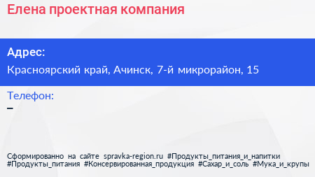 Елена, проектная компания по адресу Красноярский край, Ачинск, 7-й микрорайон, 15 в дальнейшем Организация, размещена в следующих категориях: