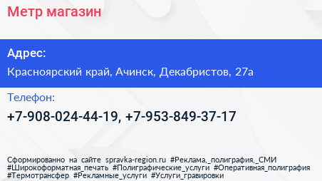 Метр, магазин по адресу Красноярский край, Ачинск, Декабристов, 27а в дальнейшем Организация, размещена в следующих категориях: