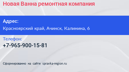 Новая Ванна, ремонтная компания по адресу Красноярский край, Ачинск, Калинина, 6 в дальнейшем Организация, размещена в следующих категориях: