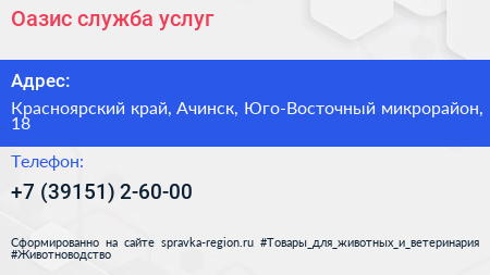 Оазис, служба услуг по адресу Красноярский край, Ачинск, Юго-Восточный микрорайон, 18 в дальнейшем Организация, размещена в следующих категориях: