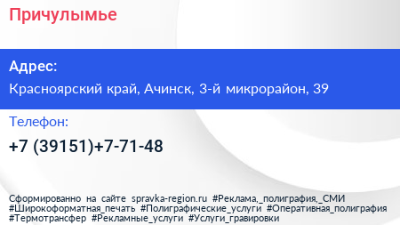 Причулымье по адресу Красноярский край, Ачинск, 3-й микрорайон, 39 в дальнейшем Организация, размещена в следующих категориях: