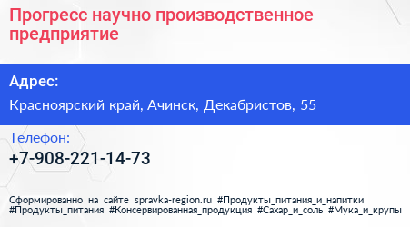 Прогресс, научно-производственное предприятие по адресу Красноярский край, Ачинск, Декабристов, 55 в дальнейшем Организация, размещена в следующих категориях:
