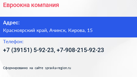 Евроокна, компания по адресу Красноярский край, Ачинск, Кирова, 15 в дальнейшем Организация, размещена в следующих категориях: