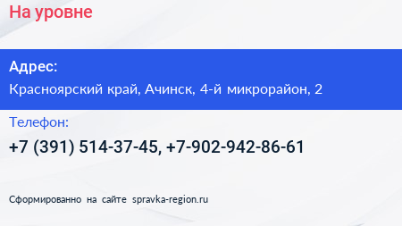 На уровне по адресу Красноярский край, Ачинск, 4-й микрорайон, 2 в дальнейшем Организация, размещена в следующих категориях: