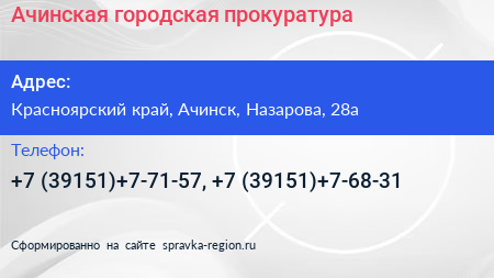 Ачинская городская прокуратура по адресу Красноярский край, Ачинск, Назарова, 28а в дальнейшем Организация, размещена в следующих категориях: