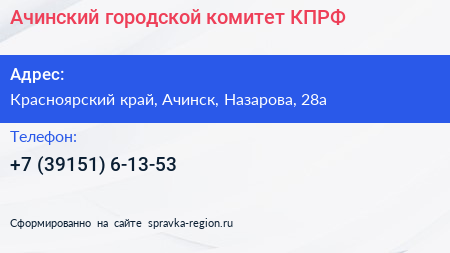 Ачинский городской комитет КПРФ по адресу Красноярский край, Ачинск, Назарова, 28а в дальнейшем Организация, размещена в следующих категориях:
